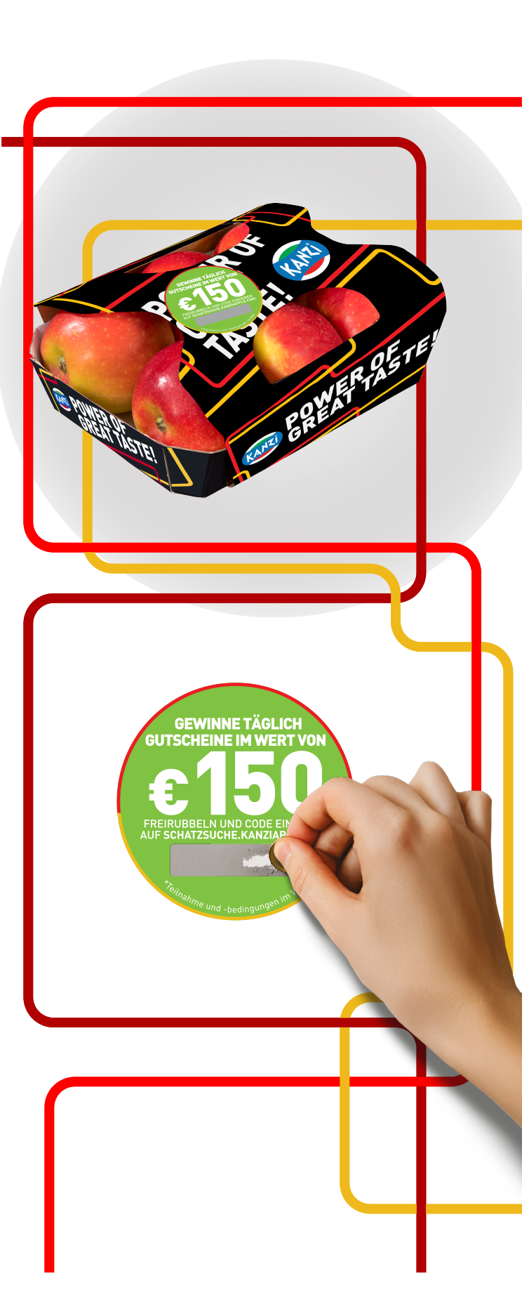 Nutze die Power of Great Taste: Bis zum 06. Dezember 2025 kannst du mit KANZI® wieder richtig abräumen! Denn in allen teilnehmenden Supermärkten findest du jetzt KANZI®-Packungen mit dem Rubbellos - oder wie wir es nennen: dem “Schatzsuche-Sticker”. Sie sind deine tägliche Chance auf einen €150,- Einkaufsgutschein.